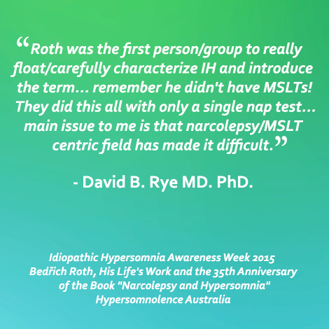 Roth was a renowned neurologist responsible for identifying and naming Idiopathic Hypersomnia. His seminal works over many years on narcolepsy and idiopathic hypersomnia have left an indelible mark on the history of sleep medicine. 2015 marked the 35th anniversary of Roth’s classic text Narcolepsy and Hypersomnia (1980 S. Karger; NY, NY). The book Narcolepsy and Hypersomnia was published in English in 1980 and is an accumulation of Roth’s work spanning more than 30 years. In fact, it is officially Roth’s second monograph on narcolepsy and hypersomnia. The first volume was published 23 years earlier in 1957 - Narcolepsy and hypersomnia from the aspect of physiology of sleep making Roth’s work the first in the area of modern day era Narcolepsy and Hypersomnia research. I spoke to several highly regarded neurological sleep physicians including those that worked closely with Roth. They gave me an insight into how Idiopathic Hypersomnia was identified and documented. They also shared with me their thoughts on more current research and issues that patients with Idiopathic Hypersomnia face due to the lack of understanding of Idiopathic Hypersomnia within areas of the medical community.